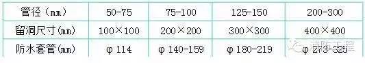 3.嚴(yán)格按照標(biāo)準(zhǔn)圖集加工制作防水套管、穿墻套管,套管長(zhǎng)度按結(jié)構(gòu)施工圖尺寸確定,套管管徑參照下列標(biāo)準(zhǔn):